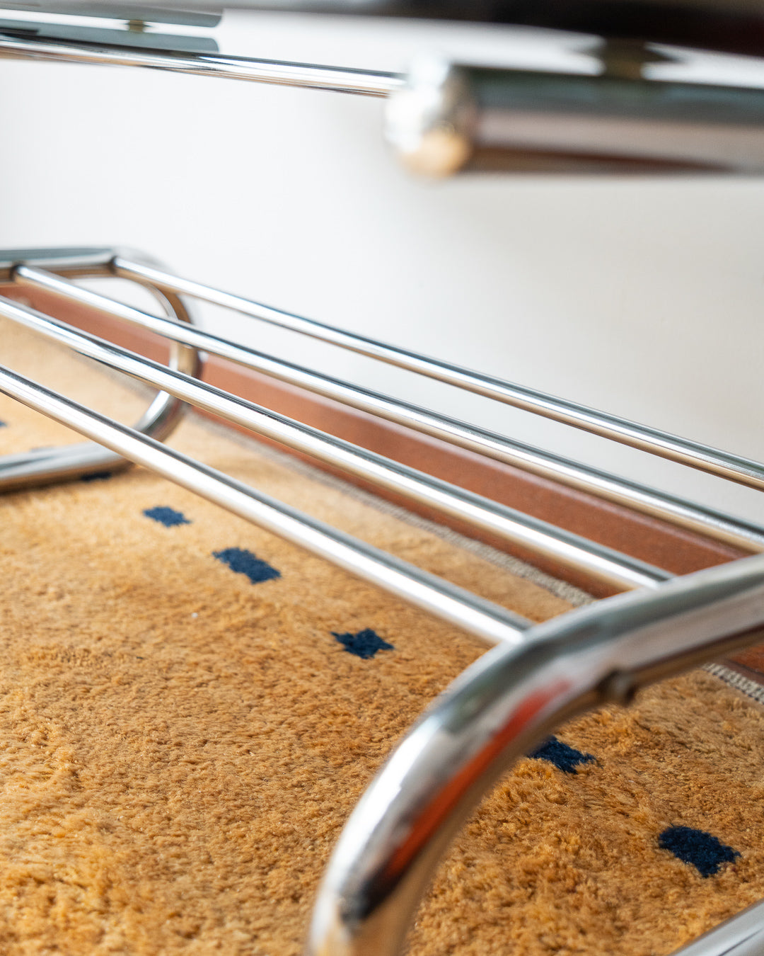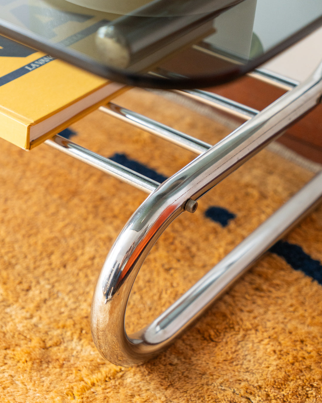 A sleek and minimal vintage center table from the 1970s. The chrome frame paired with a mid-level rack of chrome rods and a glass top creates a functional and stylish piece — perfect as a coffee table, display unit, or focal point in any living space. Fully restored, polished, and ready to impress.